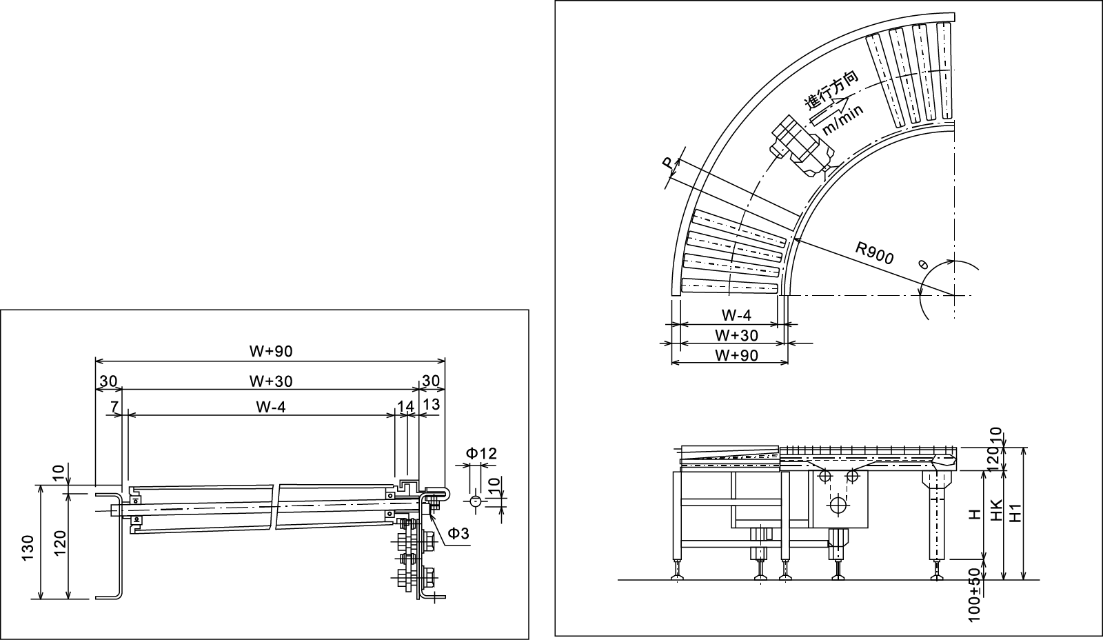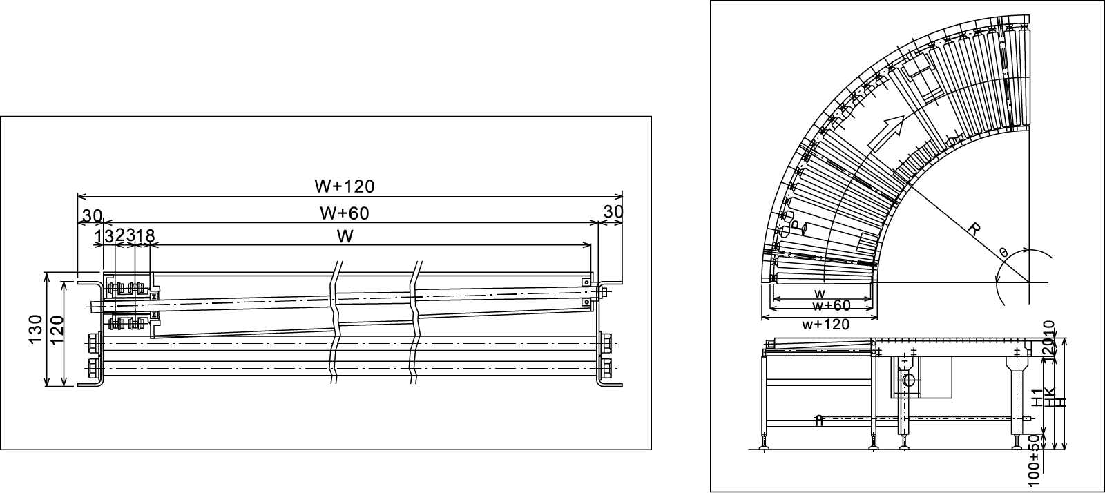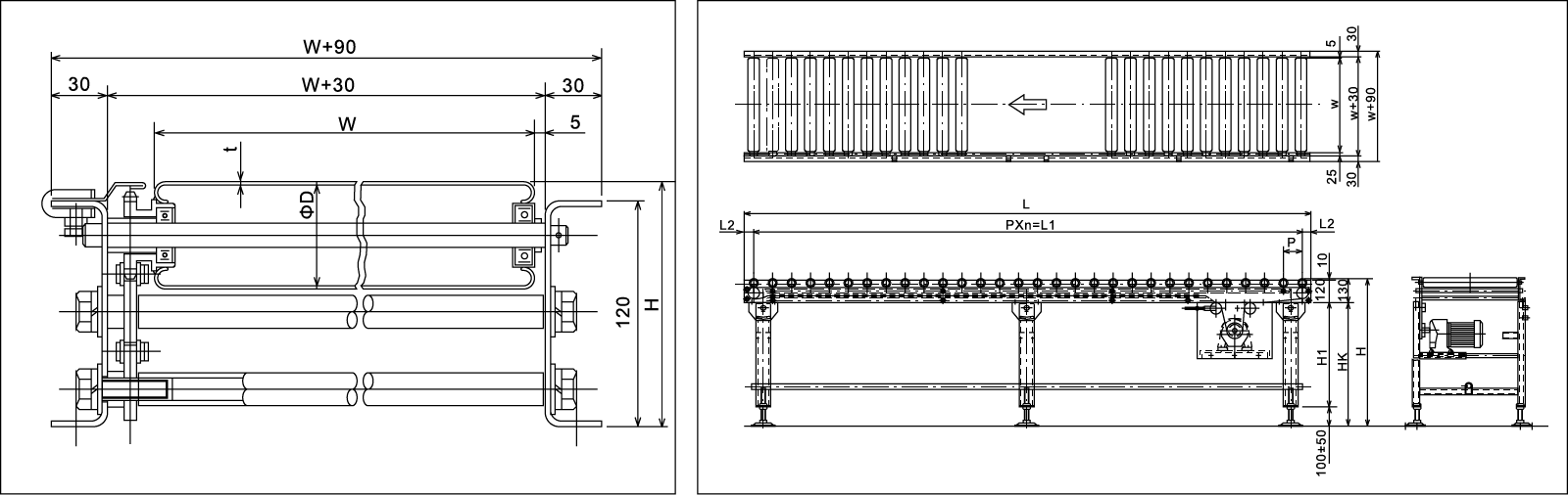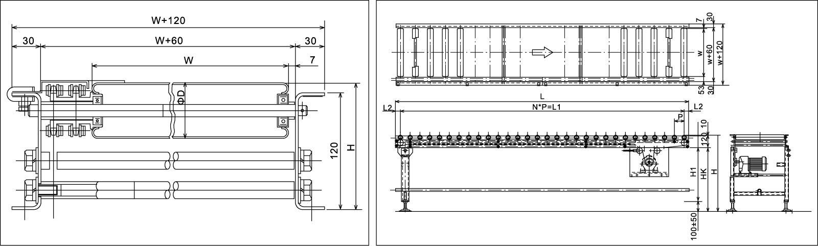 Den kjededrevne rulletransportøren er en vanlig drevet rulletransportør. Den er delt inn i enkelt- og dobbelthjulstyper basert på kjedekonfigurasjon. Enkeltkjedetransportører er egnet for tettpakkede ruller, mens dobbeltkjedetransportører er mye brukt og organisert i henhold til kjedet tonehøyde.